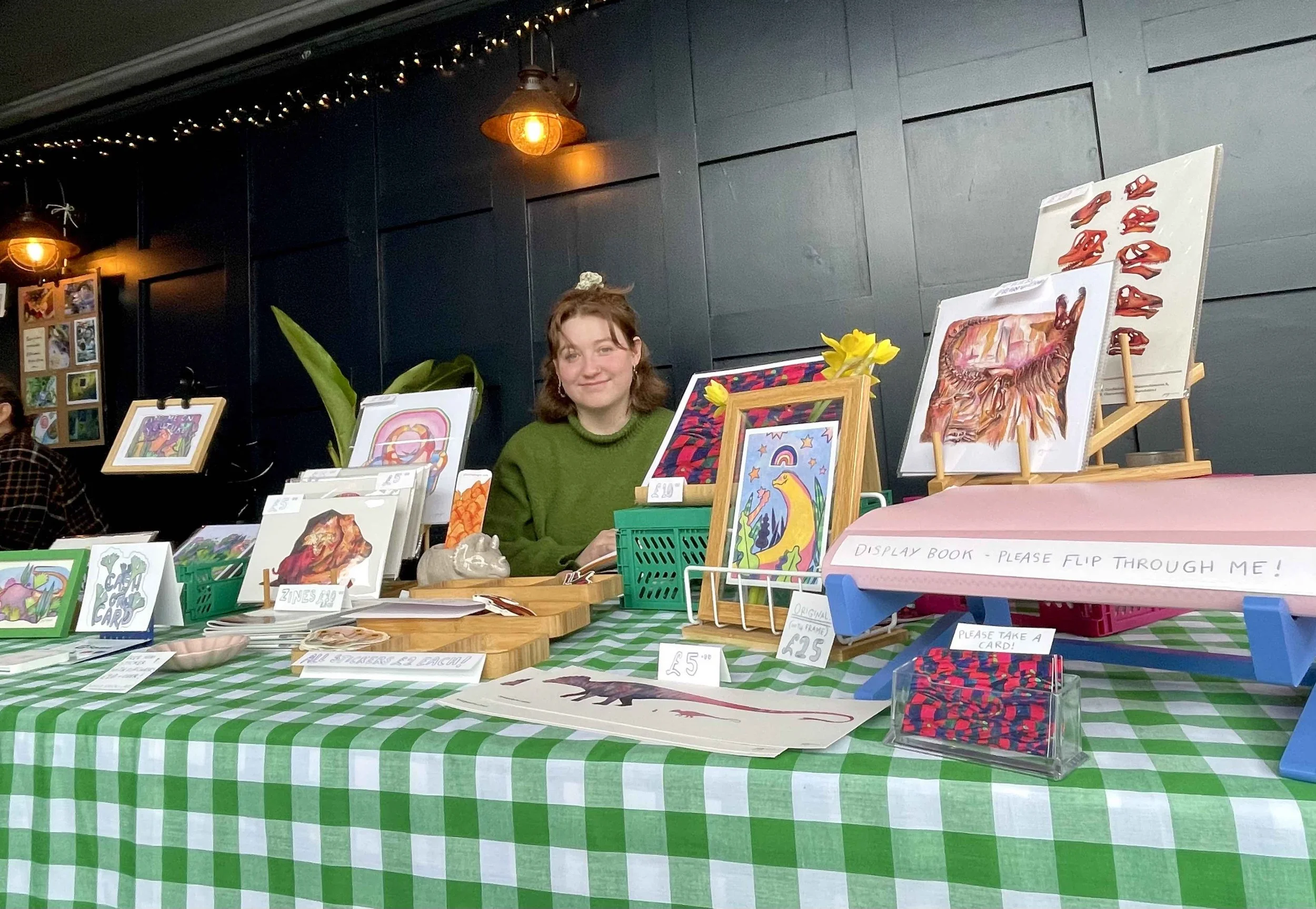 Here’s me at the art market on 25th February 2024, I ordered an excessive amount of green gingham for this market. I think it was worth it? Compliments the colours in my work nicely!